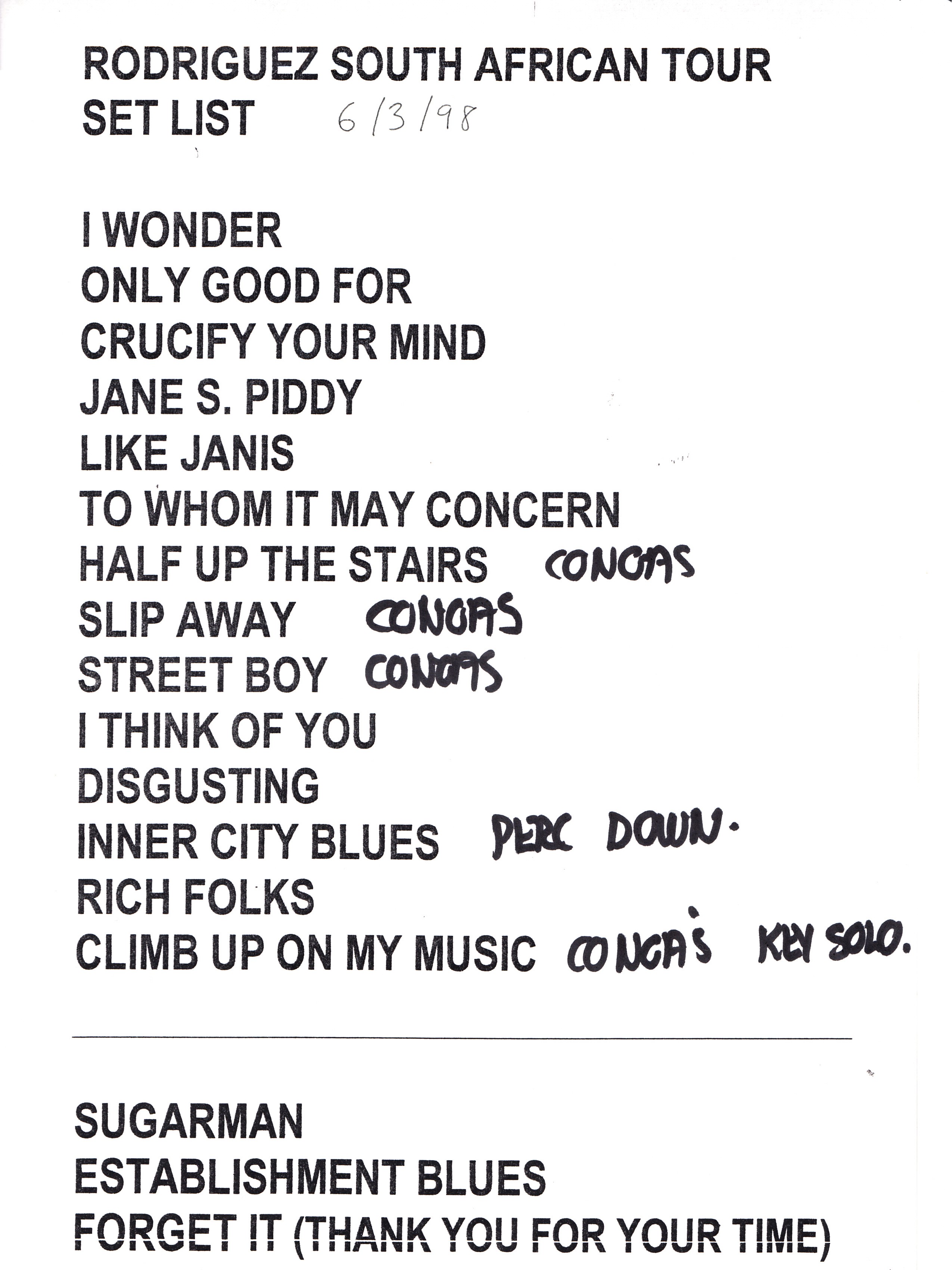 70s (and 80s and, it seems 90s) folk-rock “icon” Sixto Rodriguez played his first South African performance live at the Bellville Velodrome on Friday, 6 March 1998.