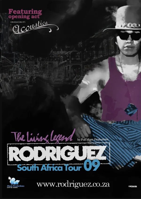 Acoustica – In 2004, Rodriquez surprised an unknown local band by appearing unexpectedly at their “Tribute To Rodriguez” show in Sedgefield, South Africa. He appreciated the enthusiasm and hard work of the band and invited them to perform with him in 4 sold-out concerts in the Garden Route. At the time, the gentle soft-spoken musician said, “I’m supporting the musicians who support me but they’re doing it better than me.” Rodriguez, is returning to South Africa once again and will be performing with one of the musicians, Graham Sindall-Gillot, from the original Rodriguez Tribute band. Graham is now the leader of the support band and opening act “Acoustica.”
