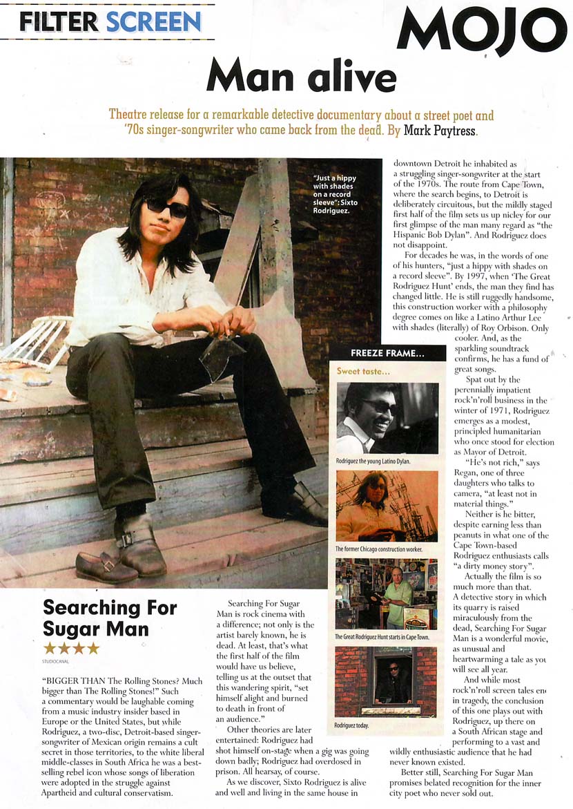Searching For Sugar Man – Mojo – Film Review – August 2012 Posted bySugarMan.org5 July 20129 July 2012Posted inNews, Newspapers & MagazinesTags:entertainment, film review, Mojo, SA Music News, Sugar Man Searching For Sugar Man – Mojo – Film Review – August 2012 -33.923776 18.423345 Discover more from SugarMan.org Subscribe to get the latest posts sent to your email. Type your email… Subscribe Share this: Click to share on Facebook (Opens in new window) Facebook Click to share on Reddit (Opens in new window) Reddit Click to share on Tumblr (Opens in new window) Tumblr Click to share on WhatsApp (Opens in new window) WhatsApp Click to email a link to a friend (Opens in new window) Email Click to share on LinkedIn (Opens in new window) LinkedIn Click to share on Pinterest (Opens in new window) Pinterest Click to share on Threads (Opens in new window) Threads Click to share on X (Opens in new window) X Click to share on Bluesky (Opens in new window) Bluesky More Click to print (Opens in new window) Print Click to share on Pocket (Opens in new window) Pocket Related Published by SugarMan.org 10 July 1942 to 8 August 2023 View more posts