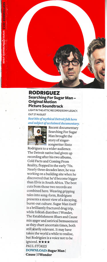 Rodriguez – Q – Searching For Sugarman Soundtrack Review – September 2012 Posted bySugarMan.org31 July 201231 July 2012Posted inNews, Newspapers & Magazines, Reviews & Interviews, Searching For Sugar Man FilmTags:Q Magazine Discover more from SugarMan.org Subscribe to get the latest posts sent to your email. Type your email… Subscribe Share this: Click to share on Facebook (Opens in new window) Facebook Click to share on Reddit (Opens in new window) Reddit Click to share on Tumblr (Opens in new window) Tumblr Click to share on WhatsApp (Opens in new window) WhatsApp Click to email a link to a friend (Opens in new window) Email Click to share on LinkedIn (Opens in new window) LinkedIn Click to share on Pinterest (Opens in new window) Pinterest Click to share on Threads (Opens in new window) Threads Click to share on X (Opens in new window) X Click to share on Bluesky (Opens in new window) Bluesky More Click to print (Opens in new window) Print Click to share on Pocket (Opens in new window) Pocket Related Published by SugarMan.org 10 July 1942 to 8 August 2023 View more posts