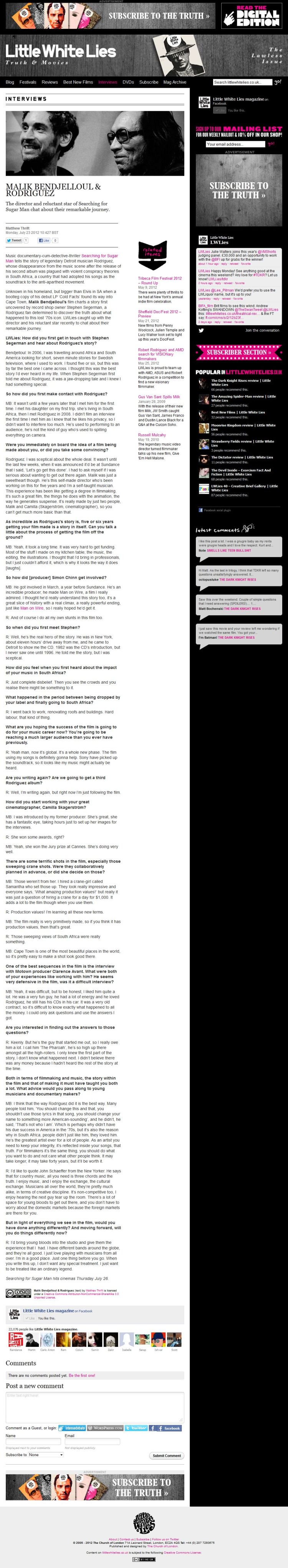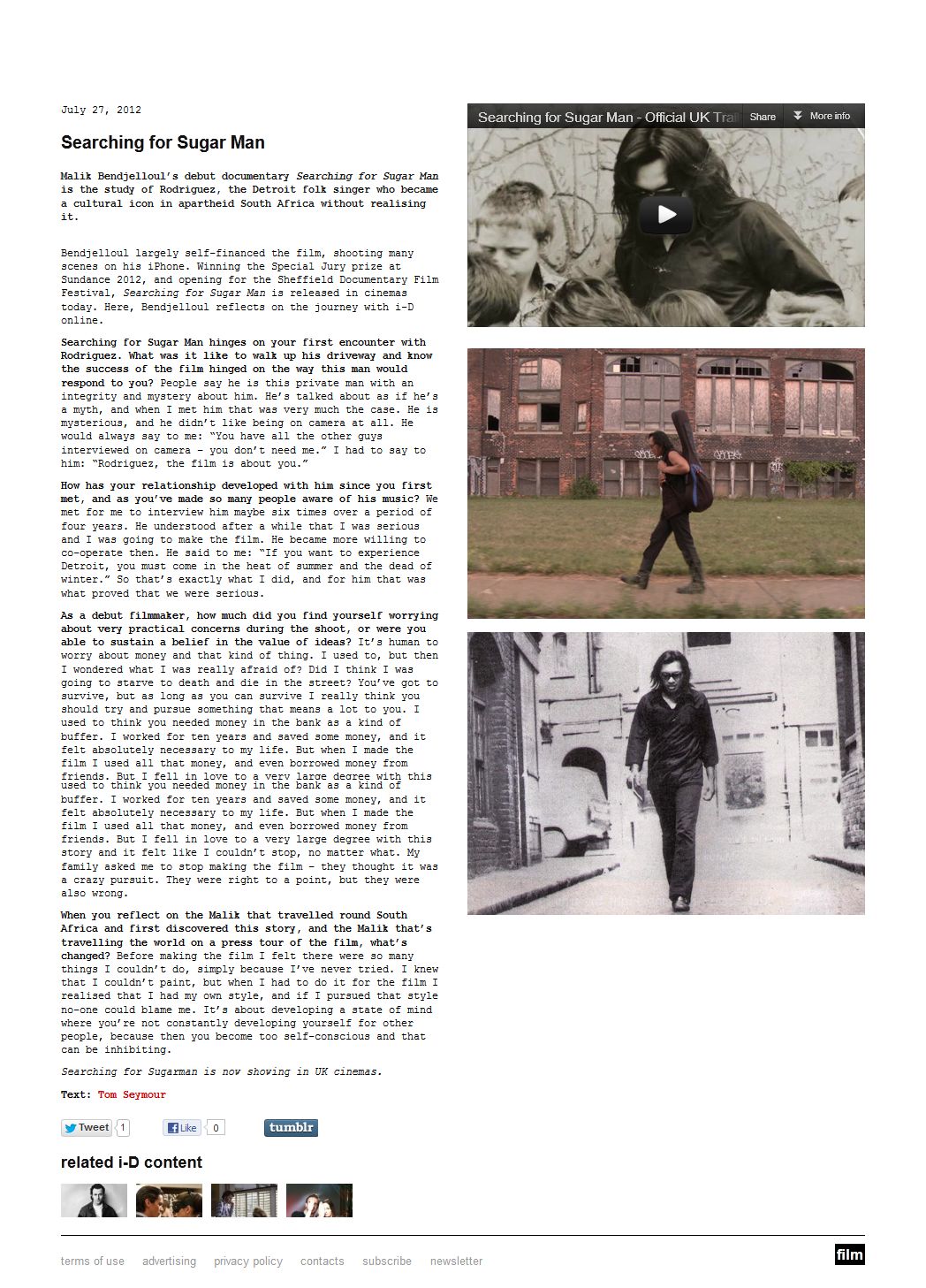 Searching For Sugar Man – Online coverage Posted bySugarMan.org31 July 201231 July 2012Posted inNewspapers & Magazines, Radio & TV, Reviews & Interviews, Searching For Sugar Man FilmTags:Searching For Sugar Man Film -33.923776 18.423345 Discover more from SugarMan.org Subscribe to get the latest posts sent to your email. Type your email… Subscribe Share this: Click to share on Facebook (Opens in new window) Facebook Click to share on Reddit (Opens in new window) Reddit Click to share on Tumblr (Opens in new window) Tumblr Click to share on WhatsApp (Opens in new window) WhatsApp Click to email a link to a friend (Opens in new window) Email Click to share on LinkedIn (Opens in new window) LinkedIn Click to share on Pinterest (Opens in new window) Pinterest Click to share on Threads (Opens in new window) Threads Click to share on X (Opens in new window) X Click to share on Bluesky (Opens in new window) Bluesky More Click to print (Opens in new window) Print Click to share on Pocket (Opens in new window) Pocket Related Published by SugarMan.org 10 July 1942 to 8 August 2023 View more posts