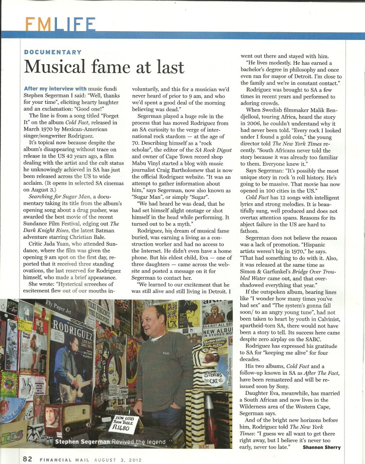Musical Fame At Last | Financial Mail Posted byBrian Currin3 August 20123 August 2012Posted inNewspapers & Magazines, Reviews & Interviews, Searching For Sugar Man Film Discover more from SugarMan.org Subscribe to get the latest posts sent to your email. Type your email… Subscribe Share this: Click to share on Facebook (Opens in new window) Facebook Click to share on Reddit (Opens in new window) Reddit Click to share on Tumblr (Opens in new window) Tumblr Click to share on WhatsApp (Opens in new window) WhatsApp Click to email a link to a friend (Opens in new window) Email Click to share on LinkedIn (Opens in new window) LinkedIn Click to share on Pinterest (Opens in new window) Pinterest Click to share on Threads (Opens in new window) Threads Click to share on X (Opens in new window) X Click to share on Bluesky (Opens in new window) Bluesky More Click to print (Opens in new window) Print Click to share on Pocket (Opens in new window) Pocket Related Published by Brian Currin Music • Web • Art View more posts