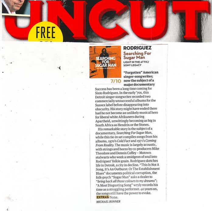 Uncut – Soundtrack Review – October 2012 Posted bySugarMan.org23 August 201223 August 2012Posted inLight In The Attic (Music Label), News, Newspapers & Magazines, Reviews & Interviews, Searching For Sugar Man FilmTags:Uncut -33.923776 18.423345 Discover more from SugarMan.org Subscribe to get the latest posts sent to your email. Type your email… Subscribe Share this: Click to share on Facebook (Opens in new window) Facebook Click to share on Reddit (Opens in new window) Reddit Click to share on Tumblr (Opens in new window) Tumblr Click to share on WhatsApp (Opens in new window) WhatsApp Click to email a link to a friend (Opens in new window) Email Click to share on LinkedIn (Opens in new window) LinkedIn Click to share on Pinterest (Opens in new window) Pinterest Click to share on Threads (Opens in new window) Threads Click to share on X (Opens in new window) X Click to share on Bluesky (Opens in new window) Bluesky More Click to print (Opens in new window) Print Click to share on Pocket (Opens in new window) Pocket Related Published by SugarMan.org 10 July 1942 to 8 August 2023 View more posts