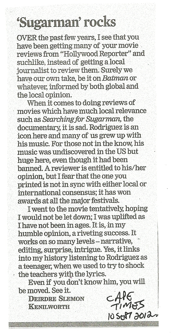 Cape Times 10 September 2012 Posted bySugarMan.org10 September 201210 September 2012Posted inNews, Newspapers & Magazines, Reviews & Interviews, Searching For Sugar Man Film Cape Times 10 September 2012 -33.923776 18.423345 Discover more from SugarMan.org Subscribe to get the latest posts sent to your email. Type your email… Subscribe Share this: Click to share on Facebook (Opens in new window) Facebook Click to share on Reddit (Opens in new window) Reddit Click to share on Tumblr (Opens in new window) Tumblr Click to share on WhatsApp (Opens in new window) WhatsApp Click to email a link to a friend (Opens in new window) Email Click to share on LinkedIn (Opens in new window) LinkedIn Click to share on Pinterest (Opens in new window) Pinterest Click to share on Threads (Opens in new window) Threads Click to share on X (Opens in new window) X Click to share on Bluesky (Opens in new window) Bluesky More Click to print (Opens in new window) Print Click to share on Pocket (Opens in new window) Pocket Related Published by SugarMan.org 10 July 1942 to 8 August 2023 View more posts