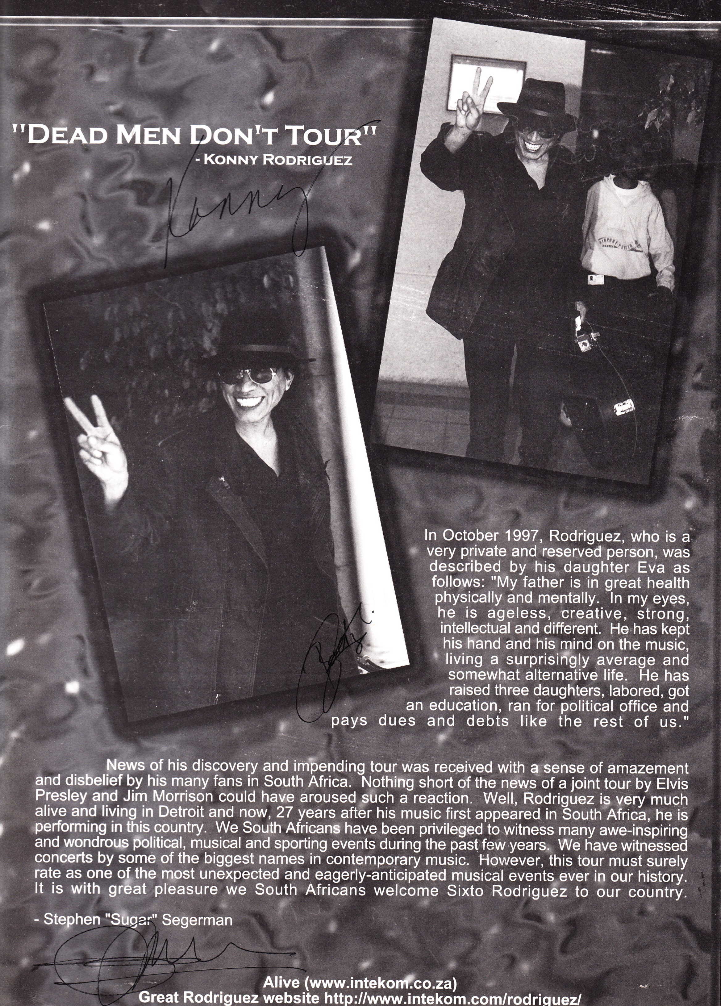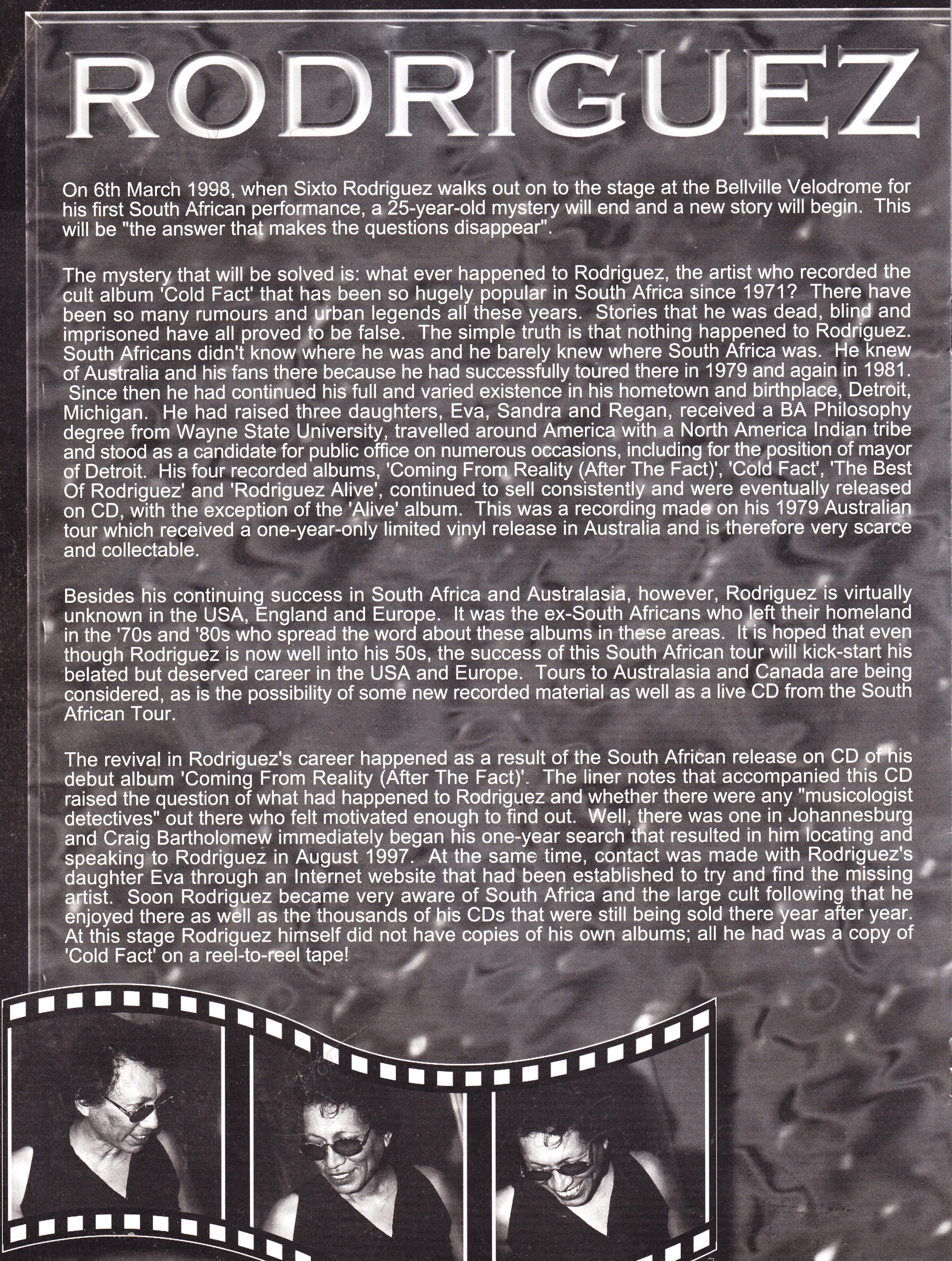 News of his discovery and impending tour was received with a sense of amazement and disbelief by his many fans in South Africa. Nothing short of the news of a joint tour by Elvis Presley and Jim Morrison could have aroused such a reaction. Well, Rodriguez is very much alive and living in Detroit and now, 27 years after his music first appeared in South Africa, he is performing in this country. We South Africans have been privileged to witness many awe-inspiring and wondrous political, musical and sporting events during the past few years. We have witnessed concerts by some of the biggest names in contemporary music. However, this tour must surely rate as one of the most unexpected and eagerly-anticipated musical events ever in our history. It is with great pleasure we South Africans welcome Sixto Rodriguez to our country.